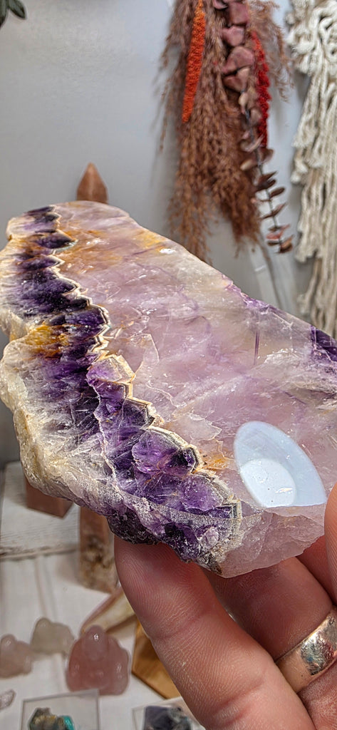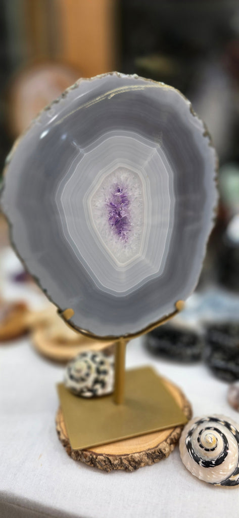 BANDED AGATE THIN SLAB WITH AMETHYST CENTER A+ QUALITY ON A STAND