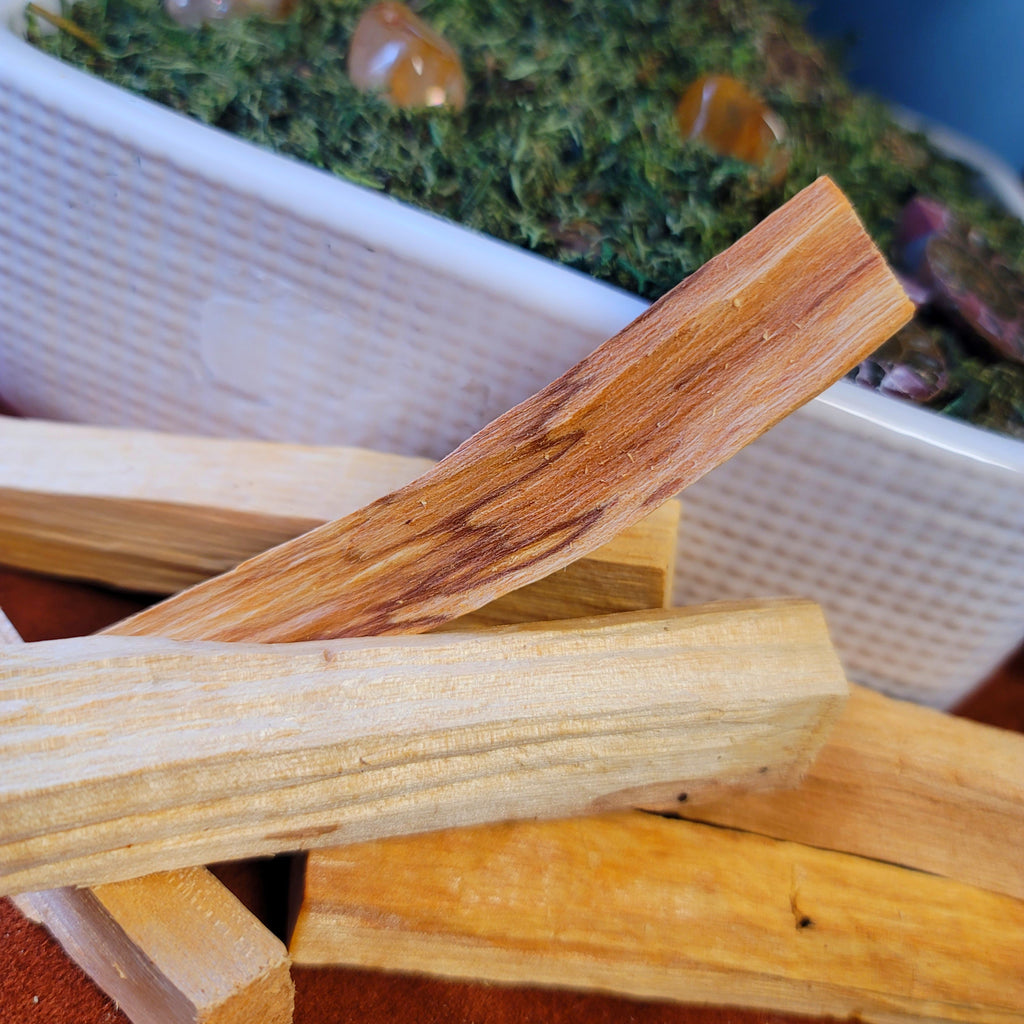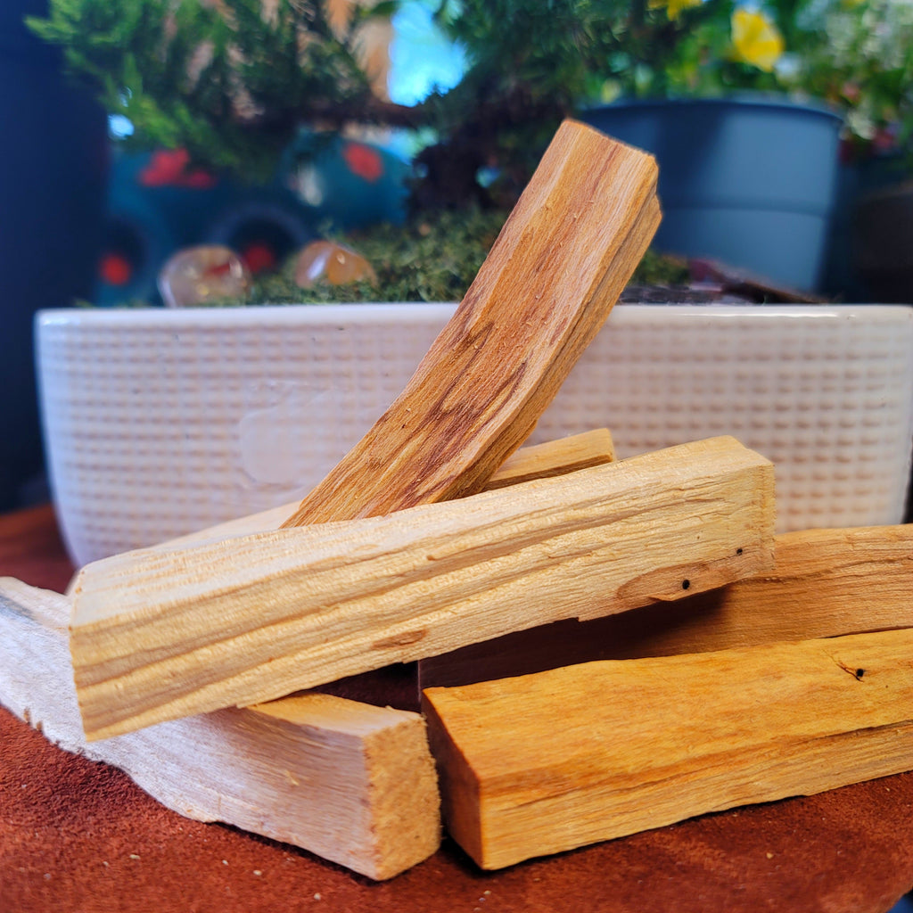 These 3 palo santo sticks come from a mystical tree that grows on the coast of South America. The name means "Holy Wood" and is used in spiritual works for its cleansing and healing properties. It has an uplifting effect and calming aroma that will allow for a deeper meditation. Palo Santo trees are protected by regulations and those sold by Crystal Islands are all harvested in a sustainable way. So only dead trees and fallen branches are harvested.