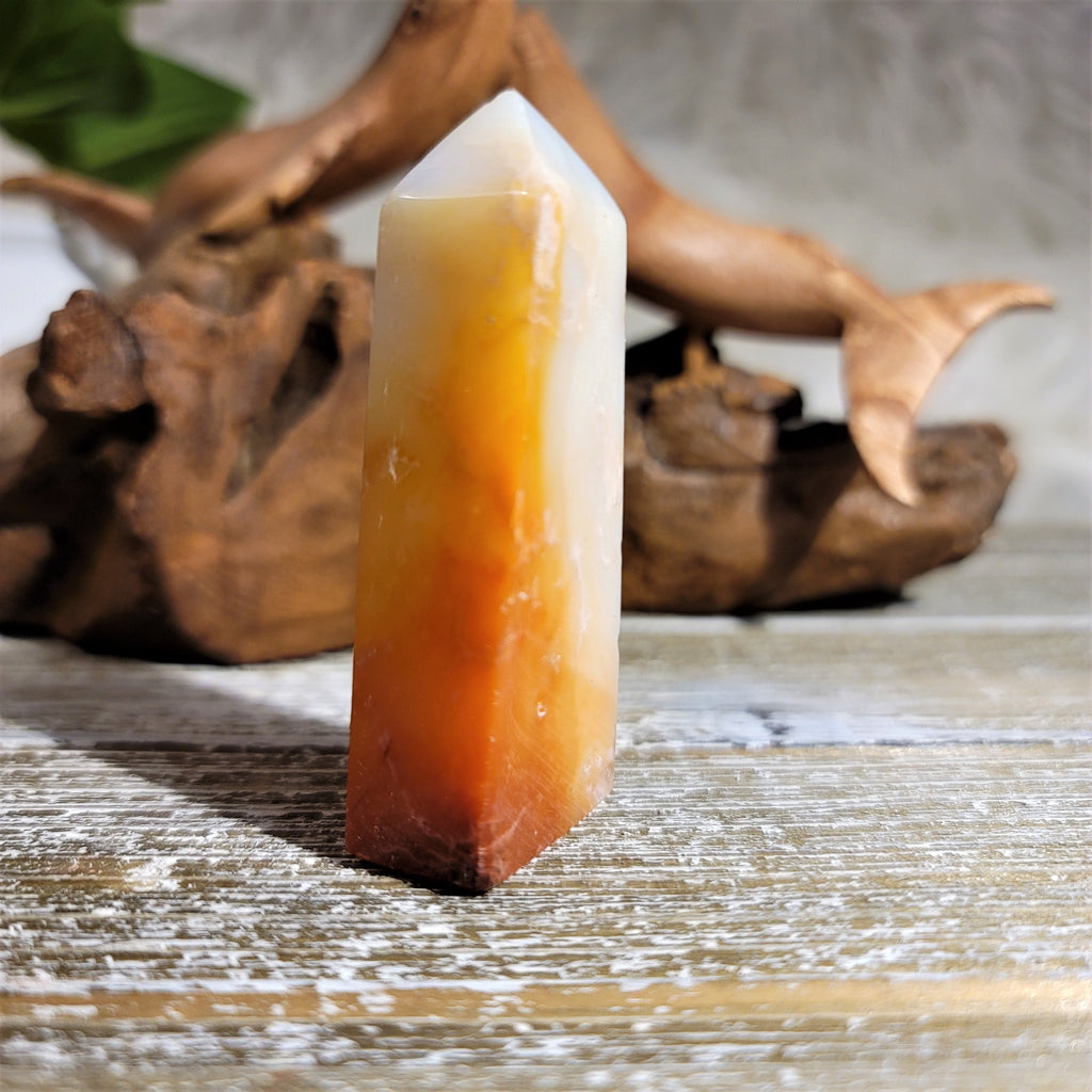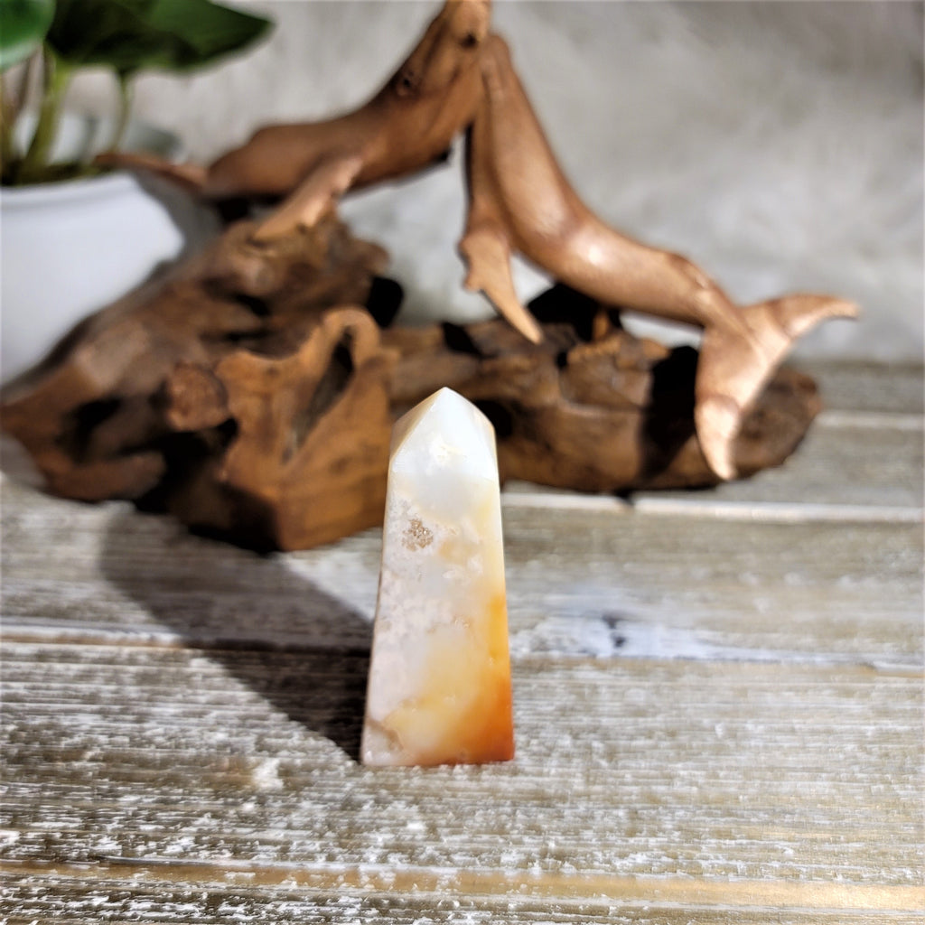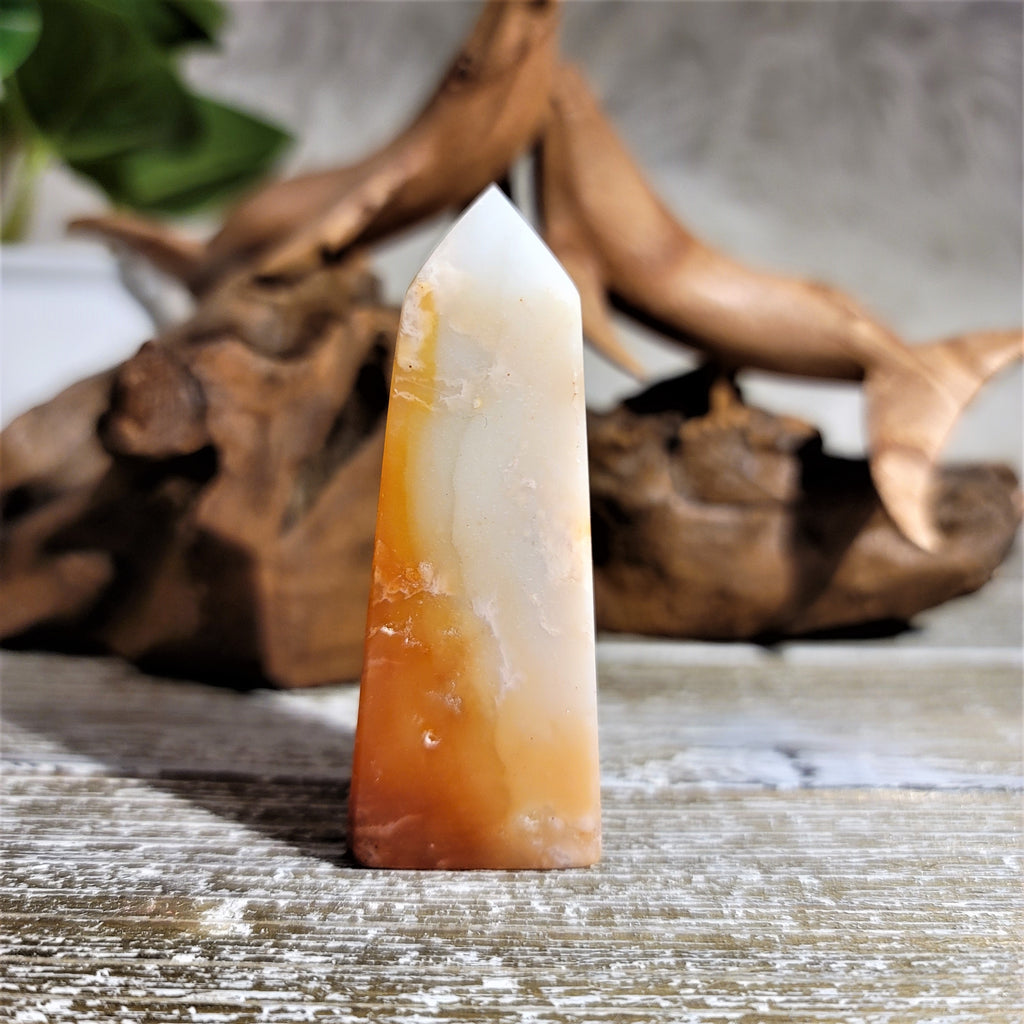 Beautiful Carnelian tower filled with druzy and healing energy. Carnelian lends in the courage to dedicate oneself to a new path. It can assist those who procrastinate or are unable to decide on a course of action. In ancient times Carnelian was believed to give courage in battle and help timed speakers become both eloquent and bold. In conventional times it is seen as a stone that supports qualities of leadership and courage.