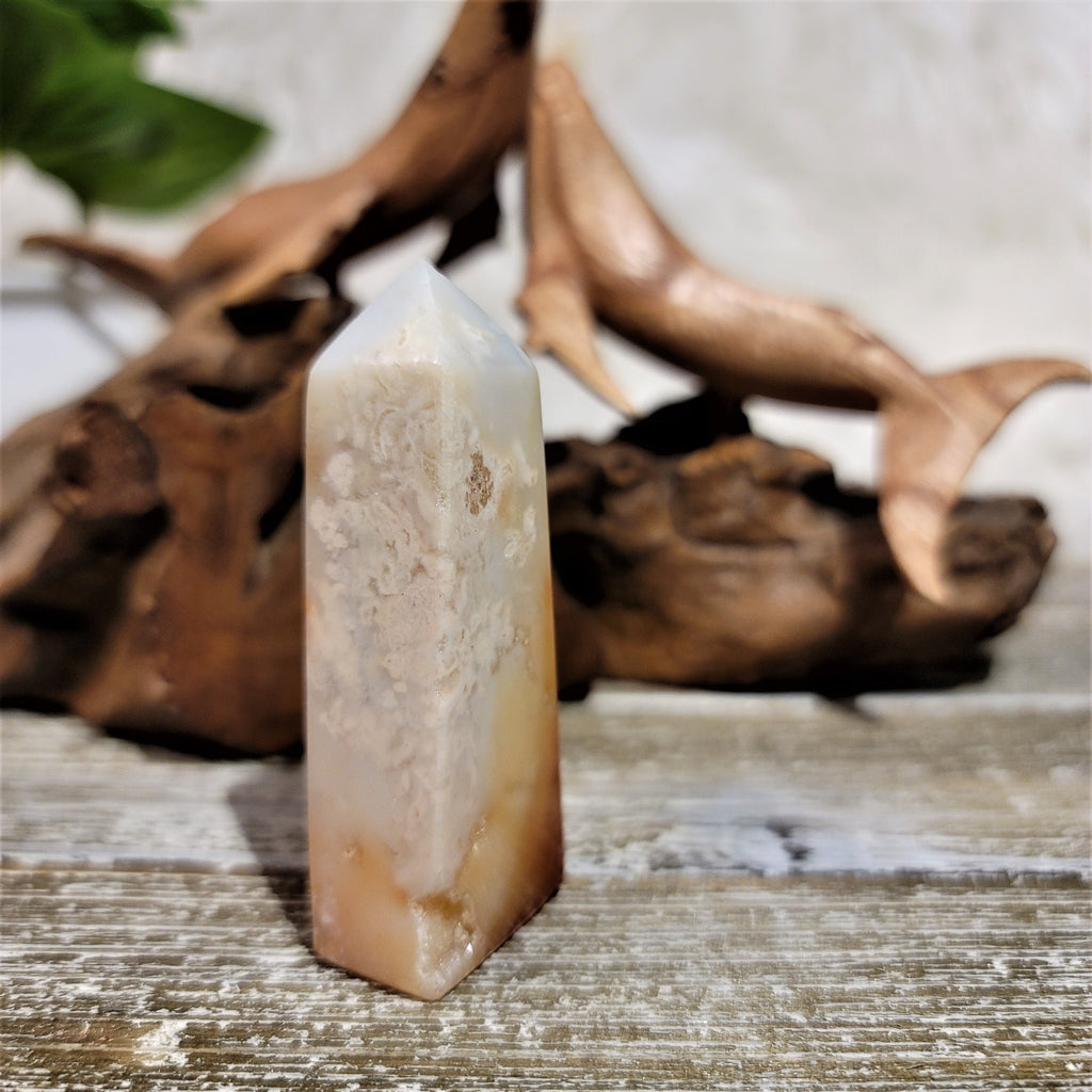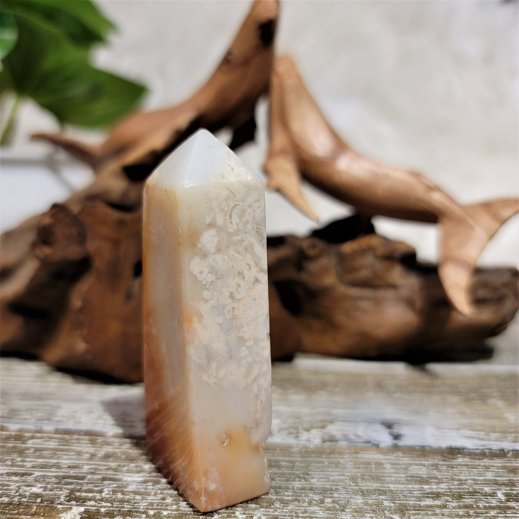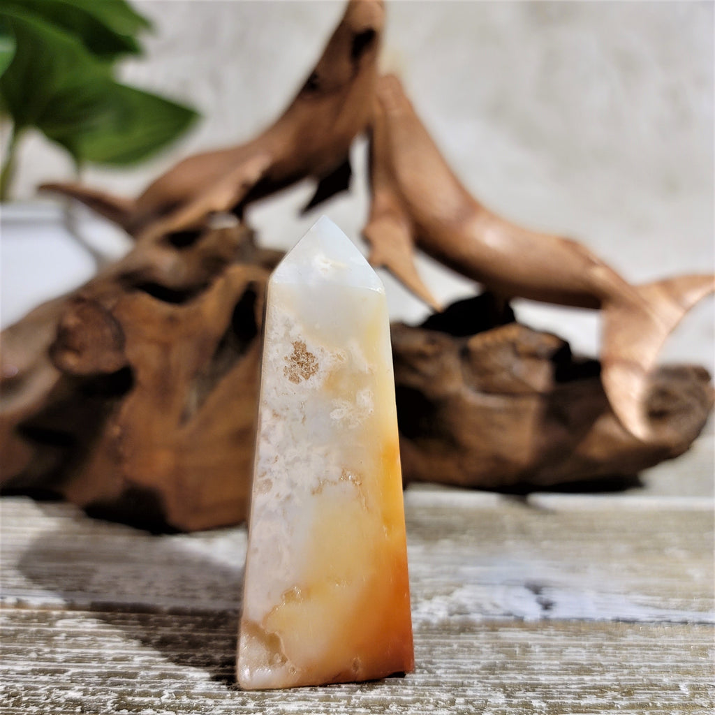 Beautiful Carnelian tower filled with druzy and healing energy. Carnelian lends in the courage to dedicate oneself to a new path. It can assist those who procrastinate or are unable to decide on a course of action. In ancient times Carnelian was believed to give courage in battle and help timed speakers become both eloquent and bold. In conventional times it is seen as a stone that supports qualities of leadership and courage.