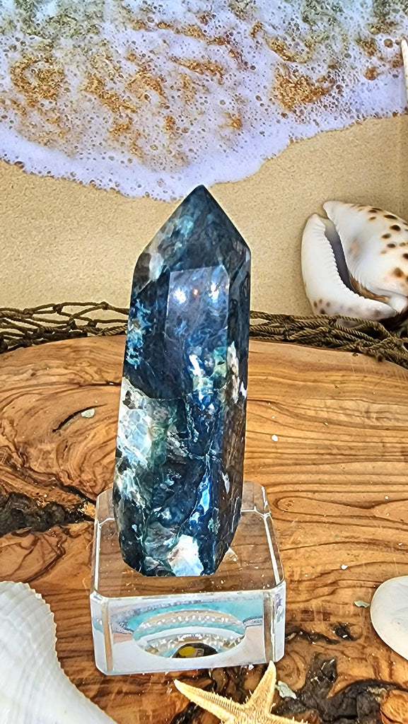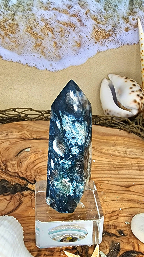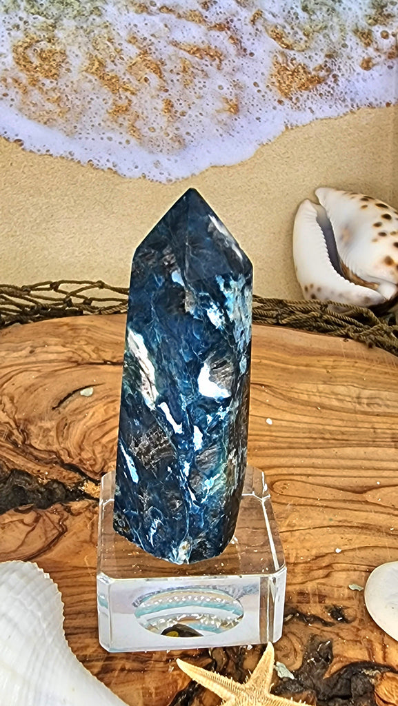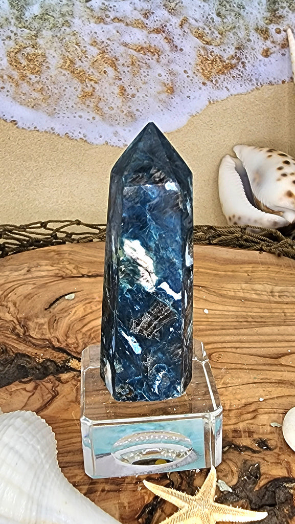 This is a Kyanite deep blue tower point with different inclusions, giving it a unique look. There is smokey quartz, mica, quartz and others included in these gem tower points. Exceptional Quality & Color. Blue Kynite's have a high vibration and create very rapid transfers of energy.