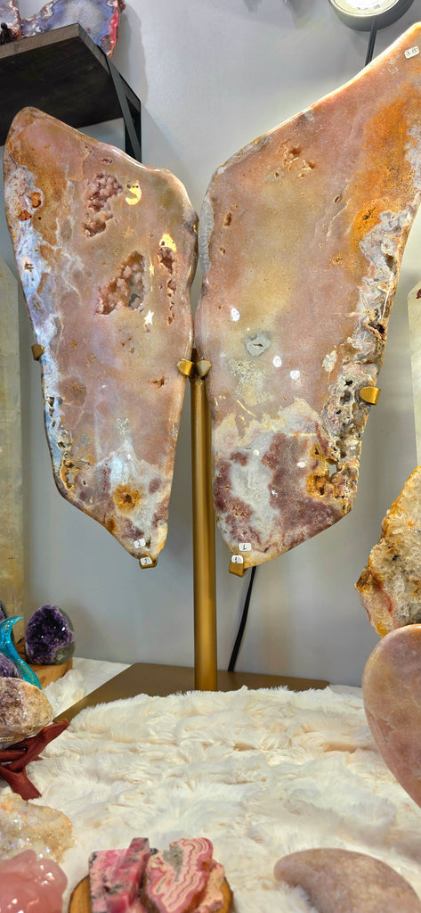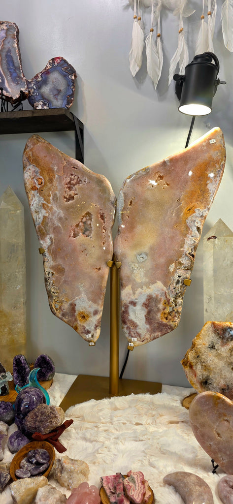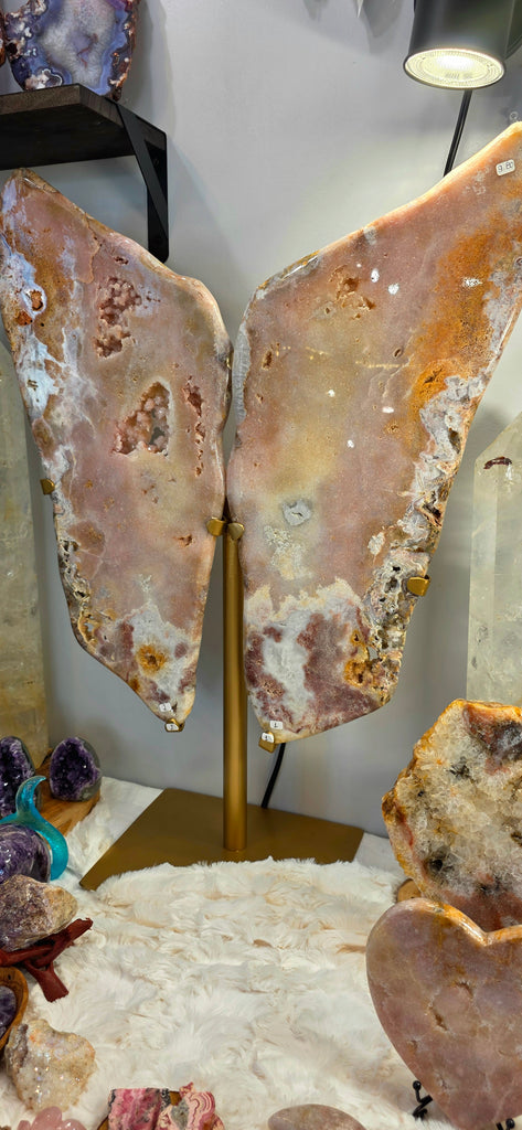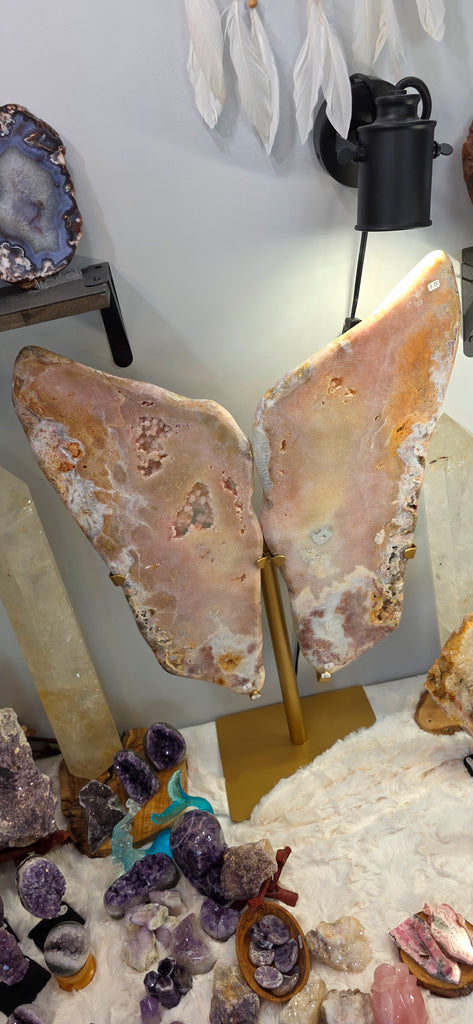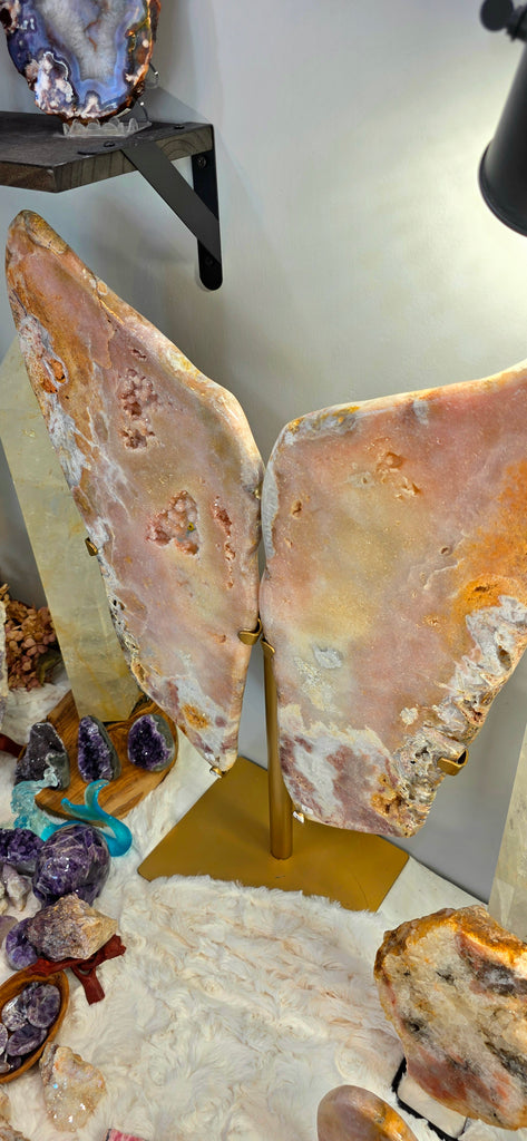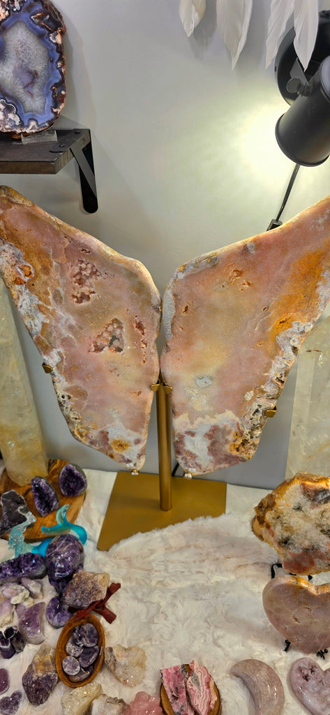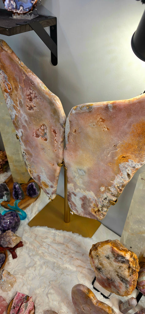 Custom carved Pink Amethyst Butterfly/Angel wings on a bronze color custom metal stand. Covered in sparkle and luster 5hat looks like they were dipped in fine glitter. A spectacular display.