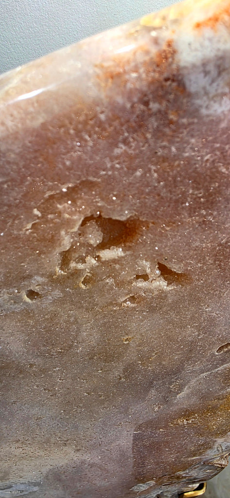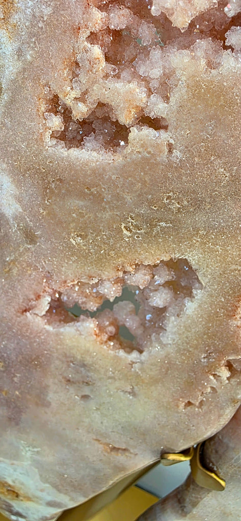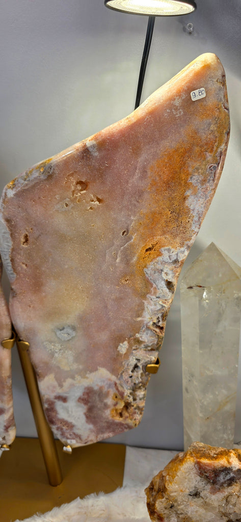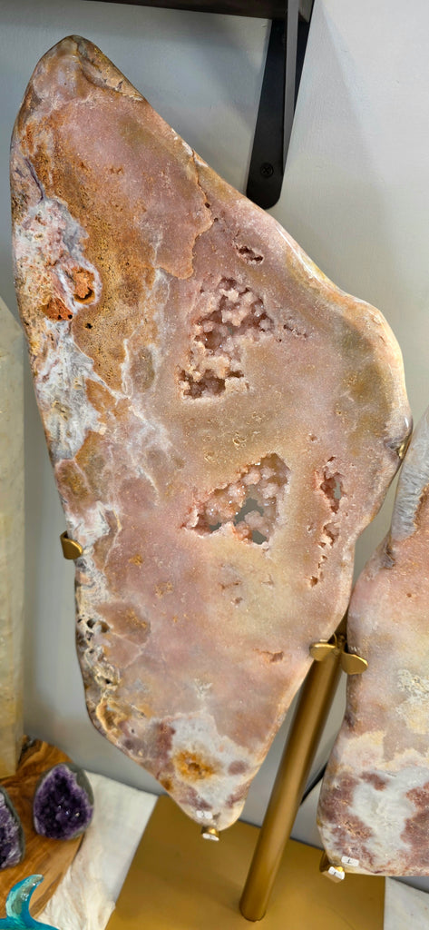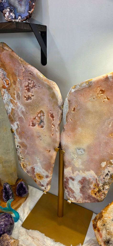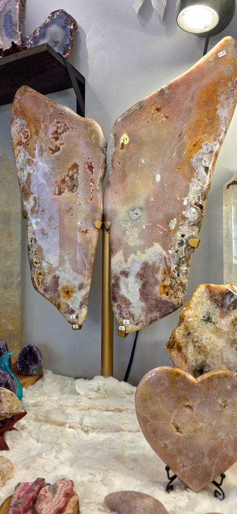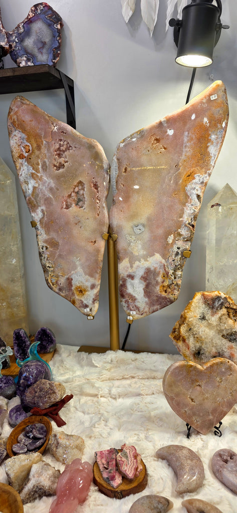 Custom carved Pink Amethyst Butterfly/Angel wings on a bronze color custom metal stand. Covered in sparkle and luster 5hat looks like they were dipped in fine glitter. A spectacular display.