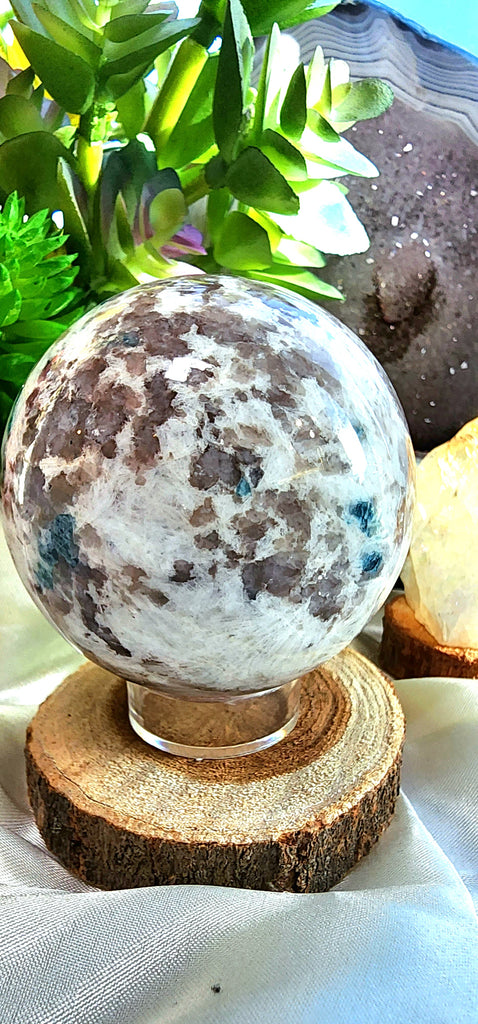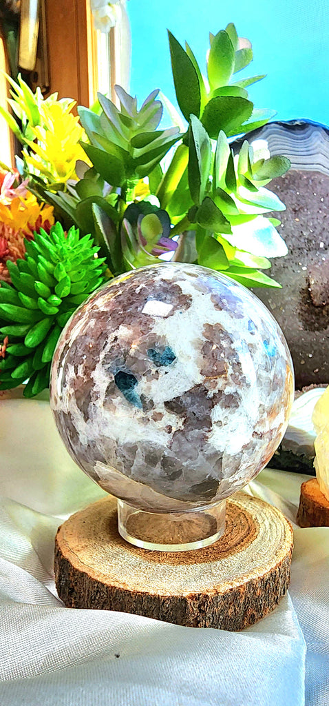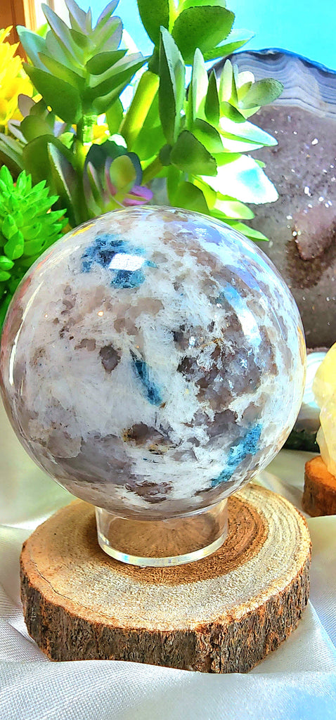 This is a high lithium quartz Snowball Euphoralite Wand with the rarest of Gem Blue Tourmaline, Albite, Mica, and many other inclusions.