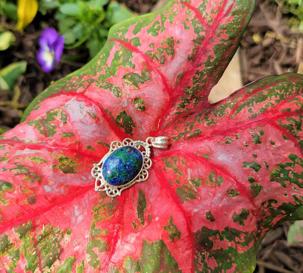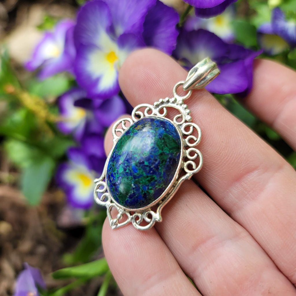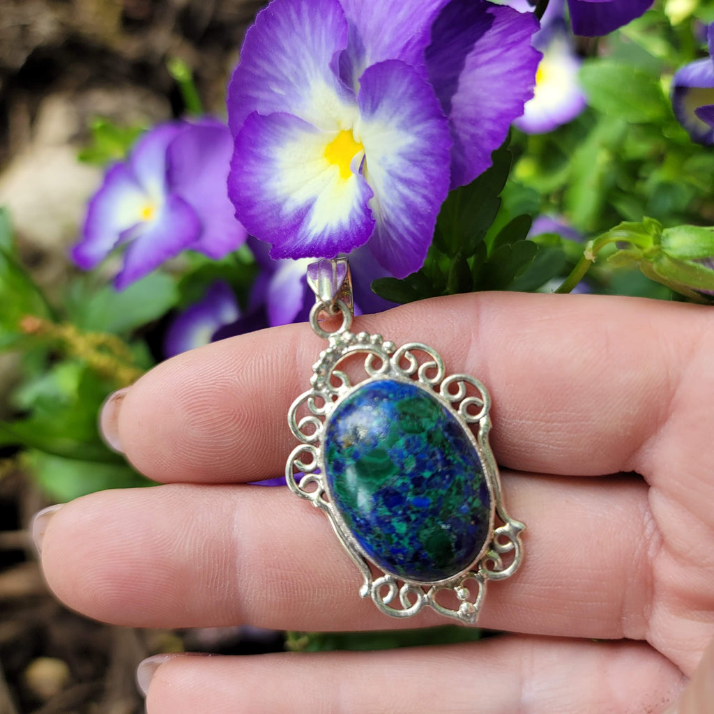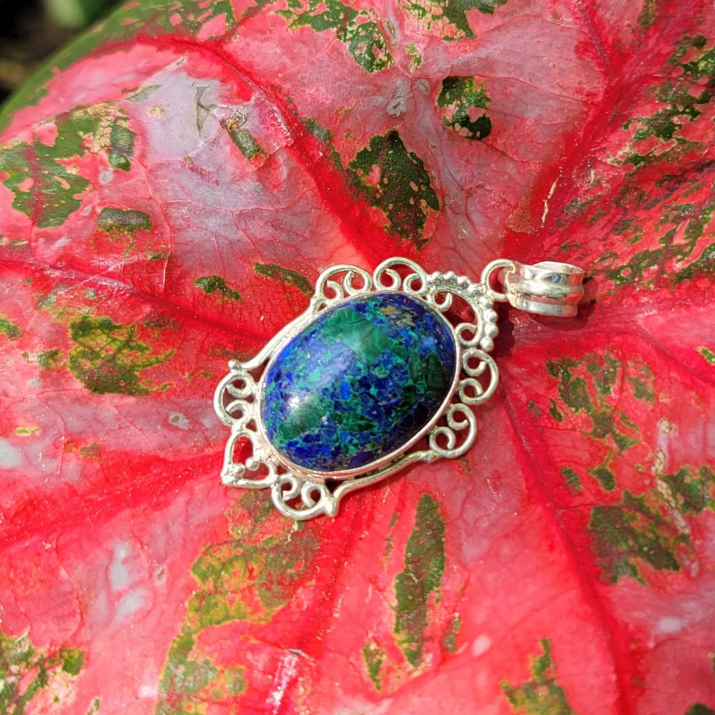 This is a solid silver setting with Azurite, Chrysocolla & some Malachite. It's good for recovering from Grief, Emotional Distress. It disspells anxieties, while also bringing an optimistic outlook. Azurite is a stone of enhancement of dreams as well as the development of psychic powers. It can stimulate intellect and intuition and it is helpful aid for those who are studying new or challenging subjects.