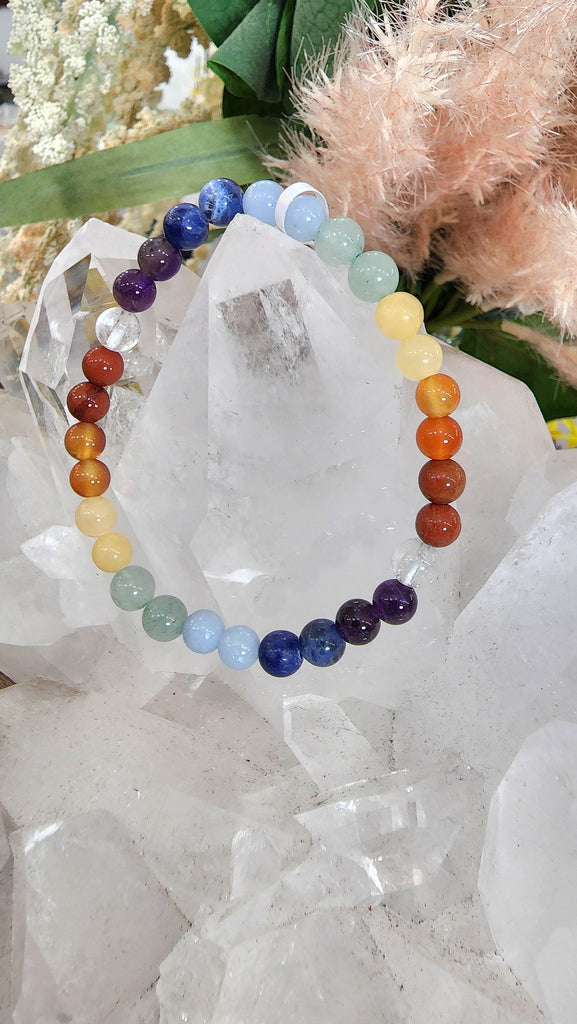 7 Chakra Stones: GREEN FLUORITE (heart), AMETHYST (third eye), RED JASPER (root), TIGER'S EYE (solar plexus), SODALITE (throat), ROCK QUARTZ (crown), RED ADVENTURINE (sacral)