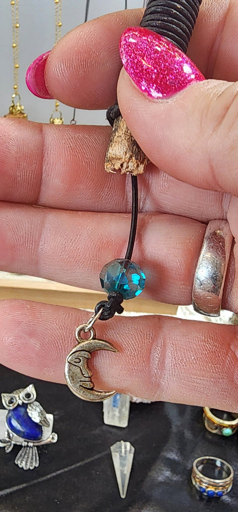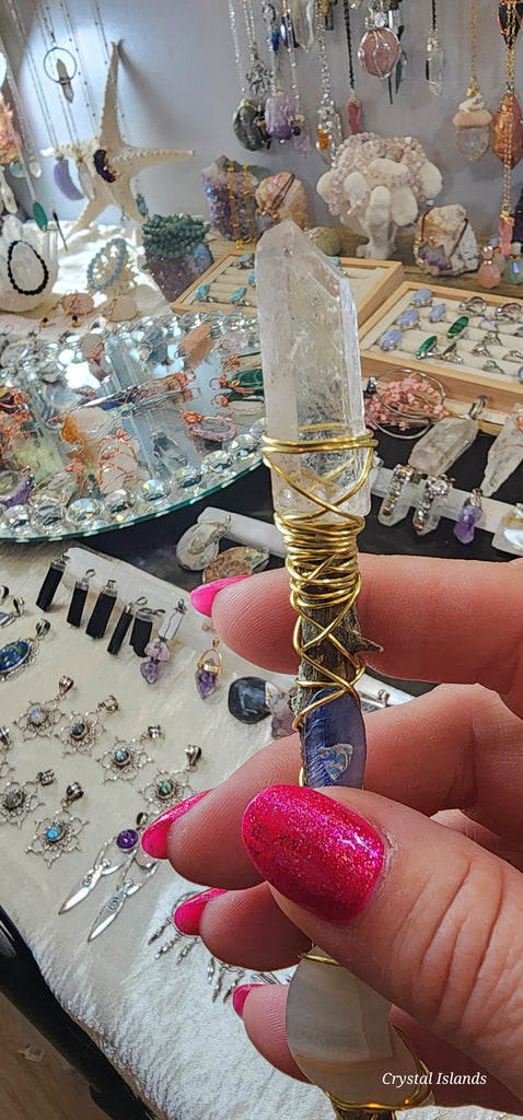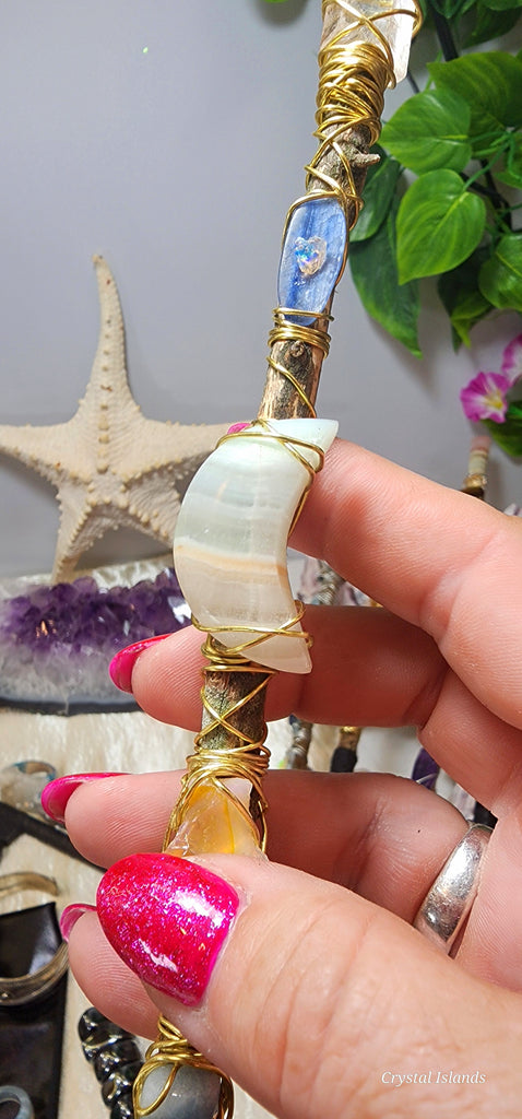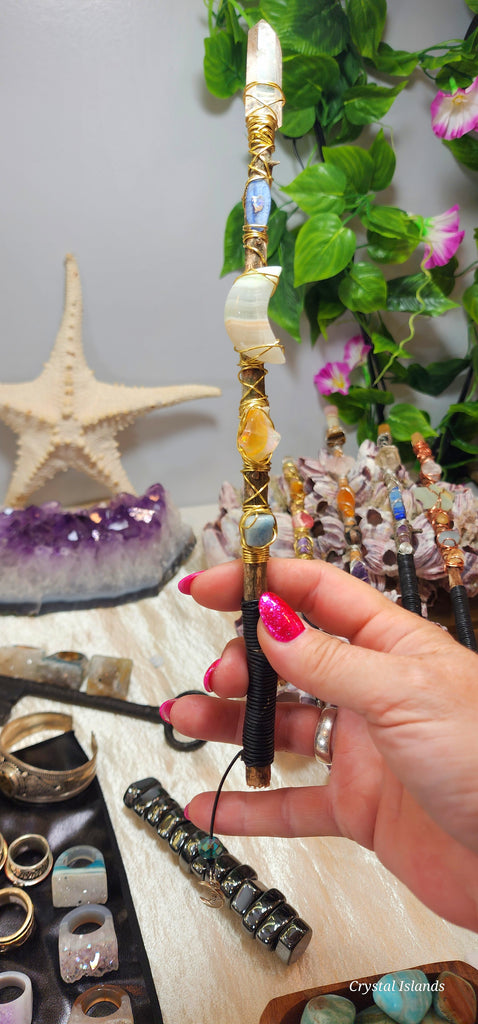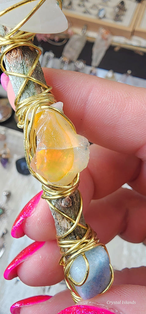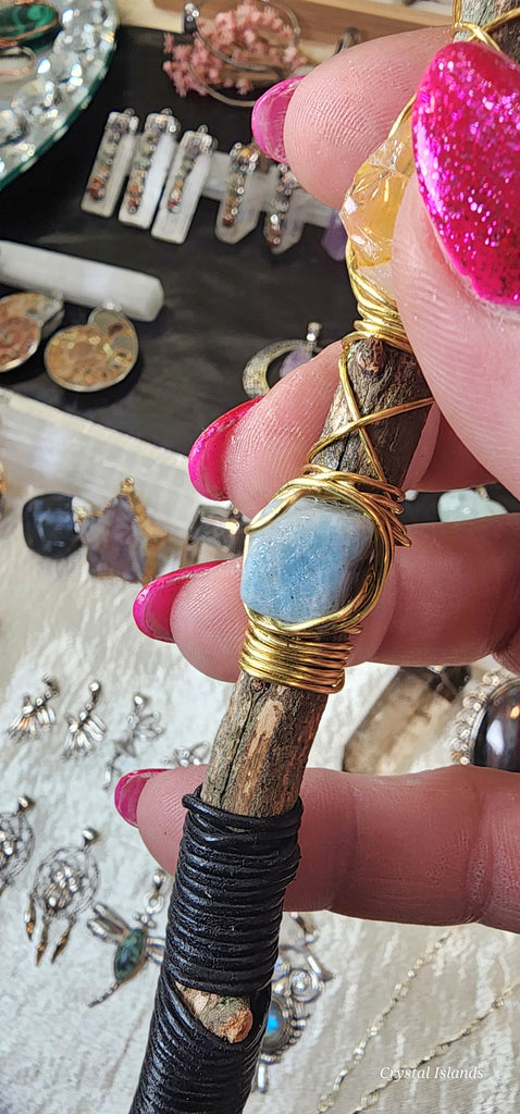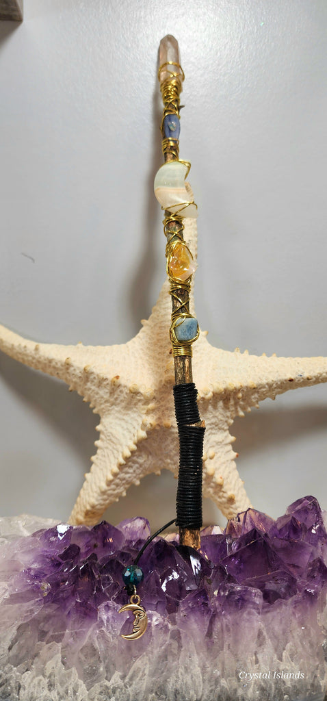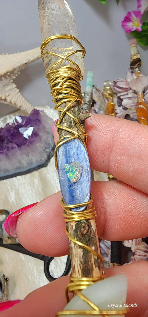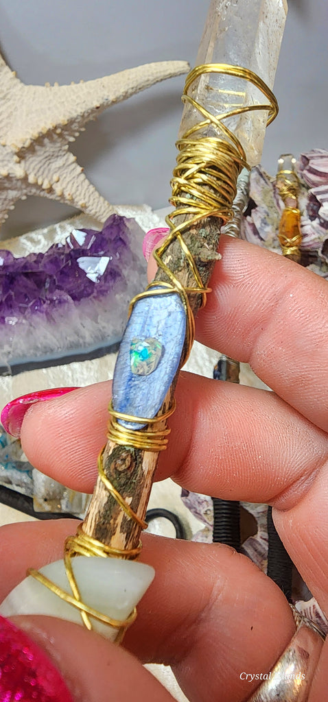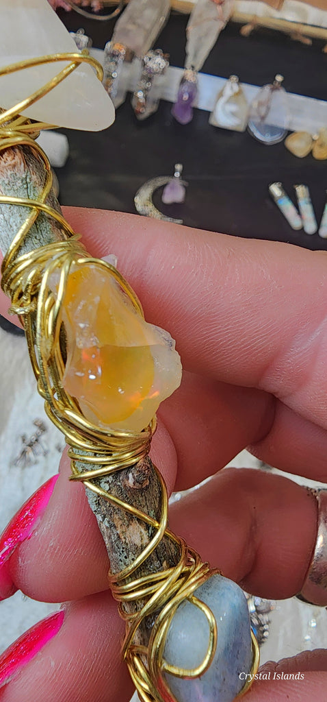 This is a hand made wand by Jen, your favorite Mermaid. I used a tree branch from the NJ Pine Barrens. This forrest has been featured on many shows for the spiritual activity there and the belief of super natural forest creatures. This wand has an Arkansas Golden Healer Point, Kyanite with Ethiopian Opal, Caribbean Calcite Moon, large Fire Opal and Aquamarine. The handle is wrapped in leather with a hanging charm.