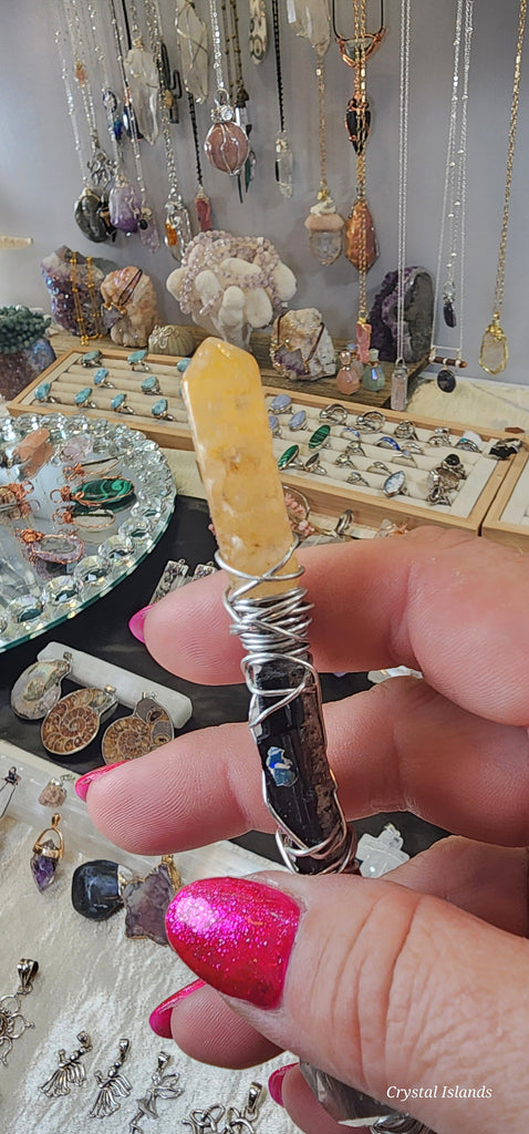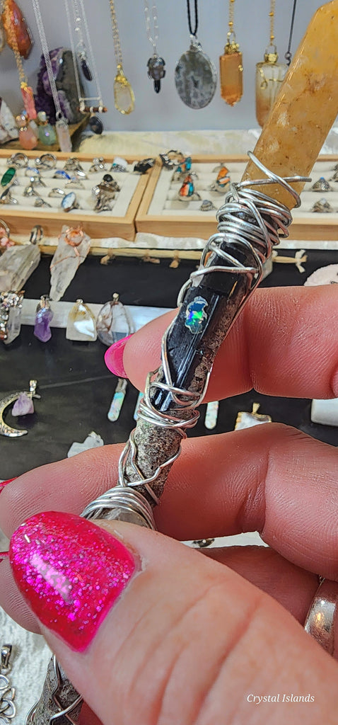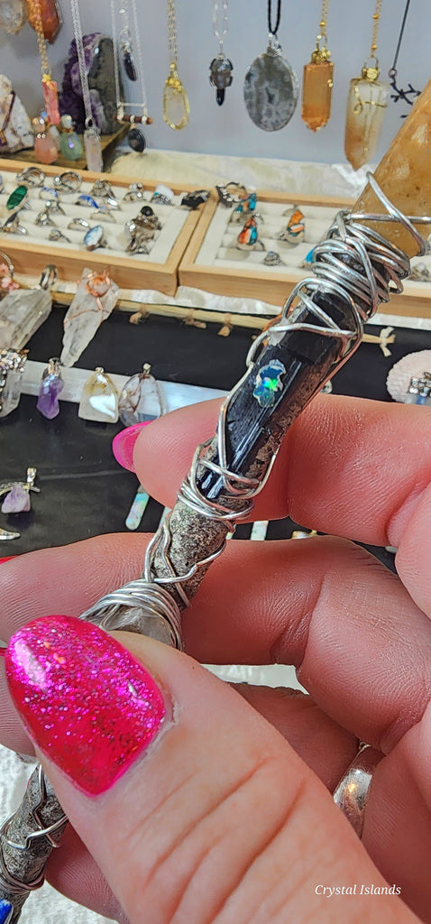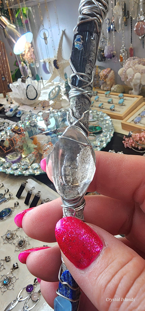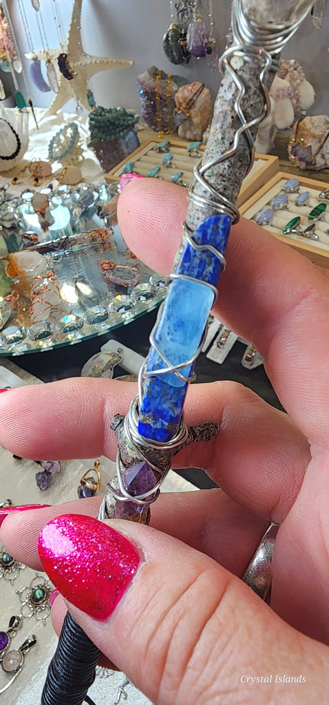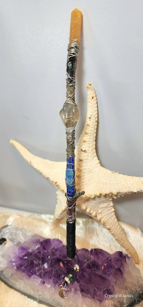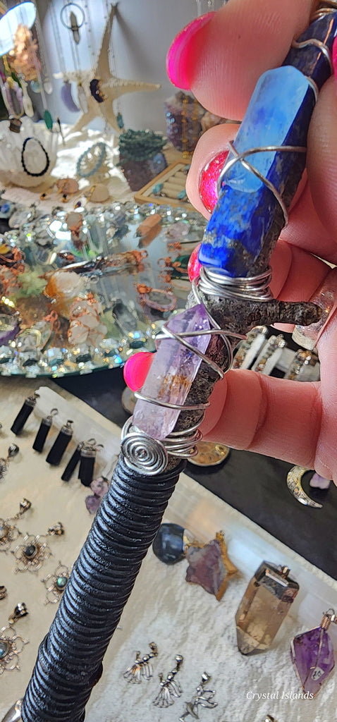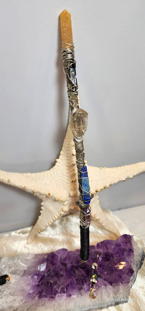 This is a hand made wand by Jen, your favorite Mermaid. I used a tree branch from the NJ Pine Barrens. This forrest has been featured on many shows for the spiritual activity there and the belief of super natural forest creatures. This wand has a Golden Healer Point, Black Tourmaline, Ethiopian Opal, Arkansas Golden Healer, Lapis, Aquamarine and a Veracruz Amethyst. A leather wrapped handle with hanging charm. The energies of these stones includes master healers, pieces that bringsl the integration of deep insights and visions, boosts creativity and new ideas, cooling and calming under the stresses if life.. stones that reveal your 6st sense abilities and brings empowerment to take the chances to follow your dreams. These are just some of the properties these stones are known for.