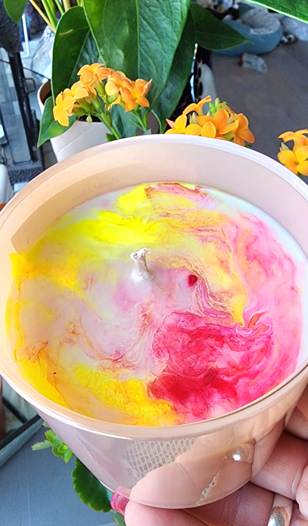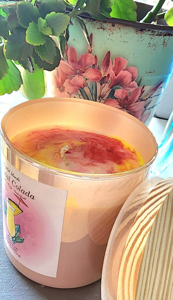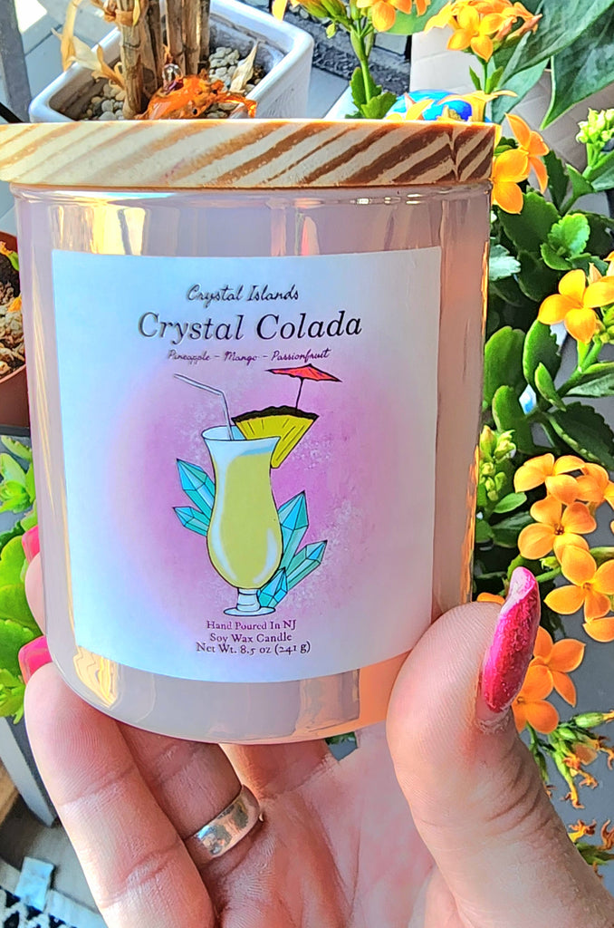 This is a hand poured soy wax candle.Β The scented oils are Pineapple, Mango & Passion Fruit.Β It smells like your in paradise.. like your on Cryatal Island!