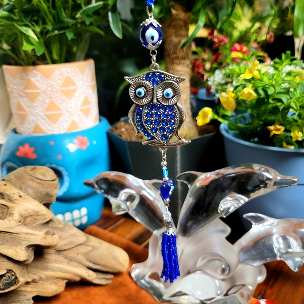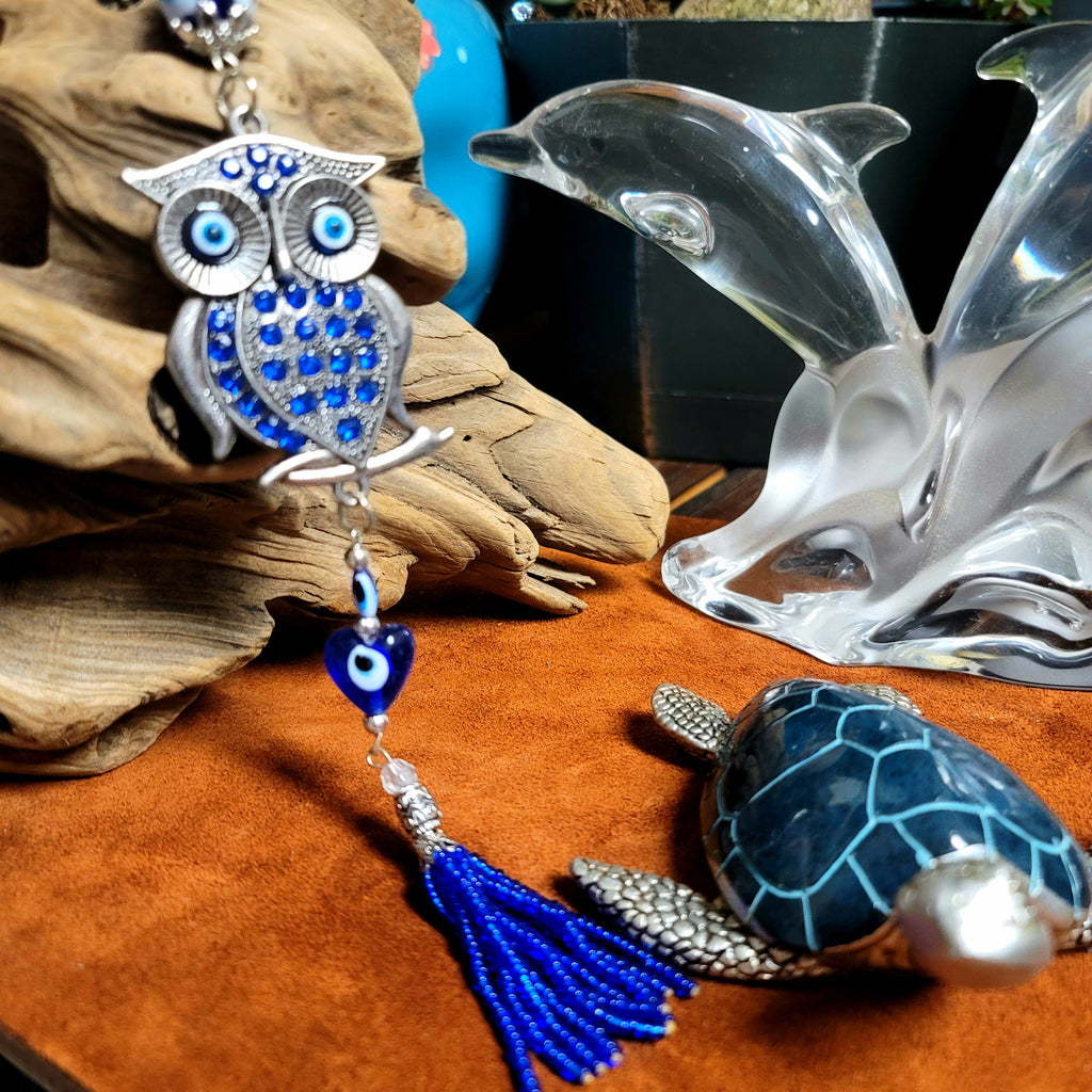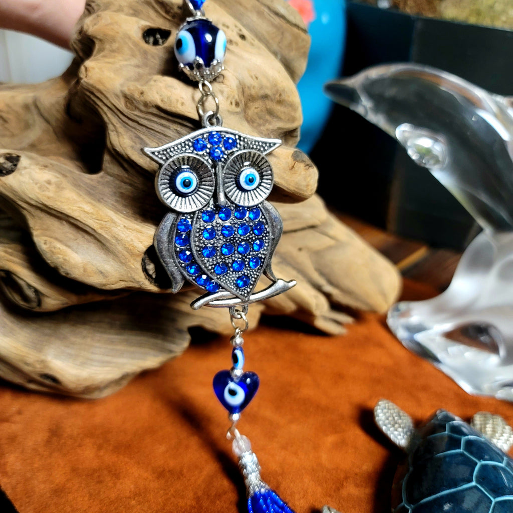 This owl is adorned with the evil eye a symbol of protection from those who would wish to do you harm. It can be hung by the rear view mirror or anywhere you wish.