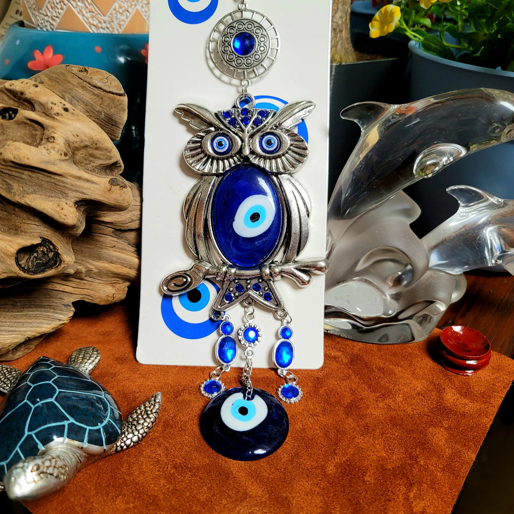 This is a Metal Evil Eye adorned owl hanging. The evil eye has been used to protect you from harm, and from those who mean to do you harm.