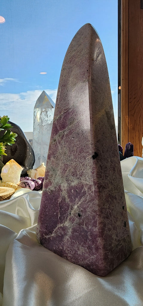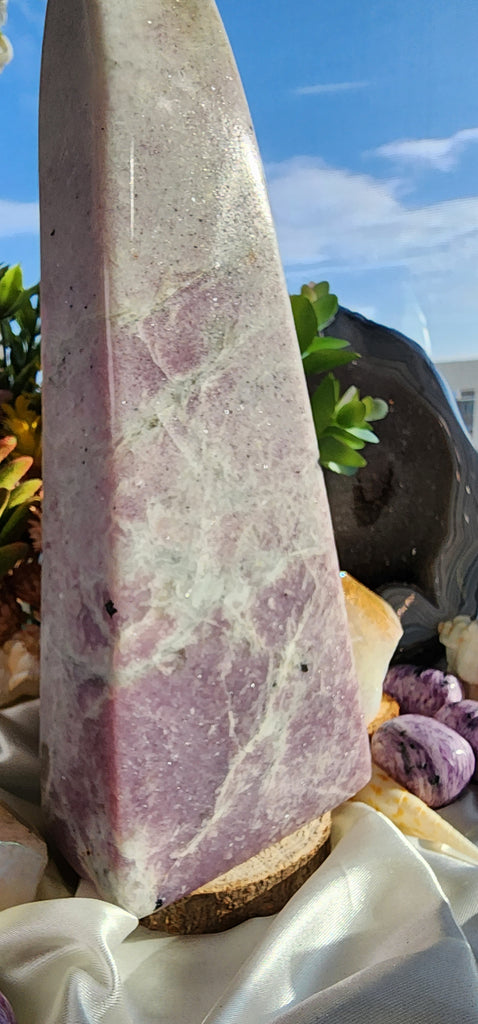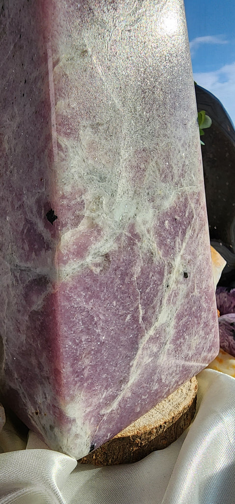 There is crushed blue tourmaline in the matrix throughout this piece, slong with the many other inclusions. This size is so rare that only a small ammount exhist.