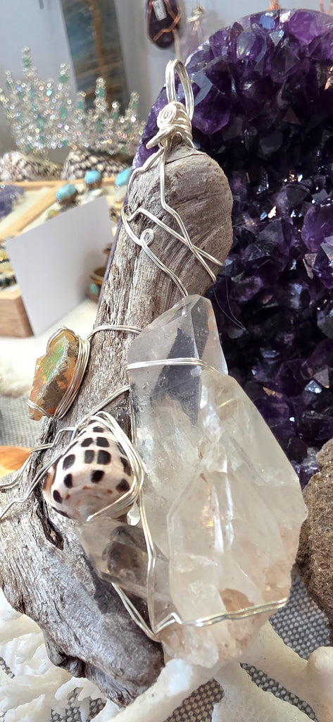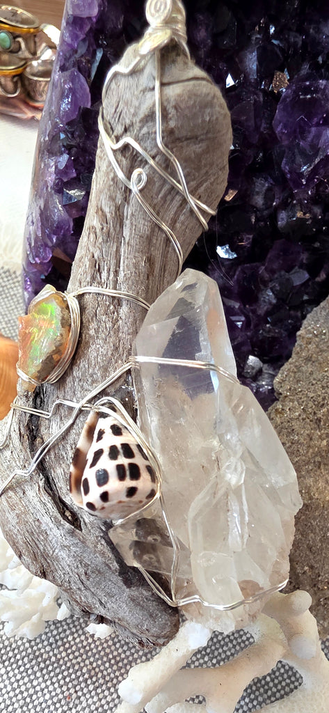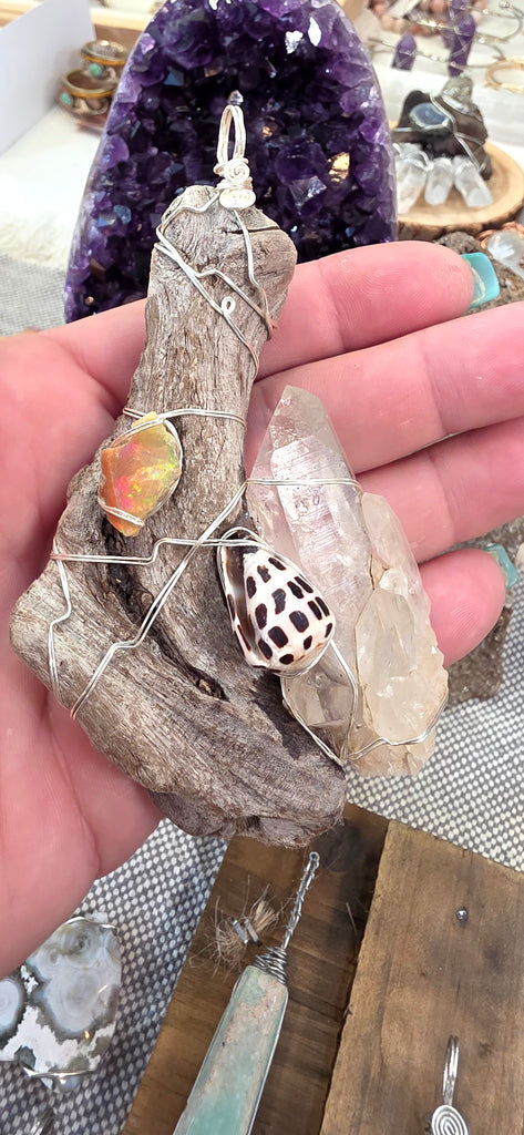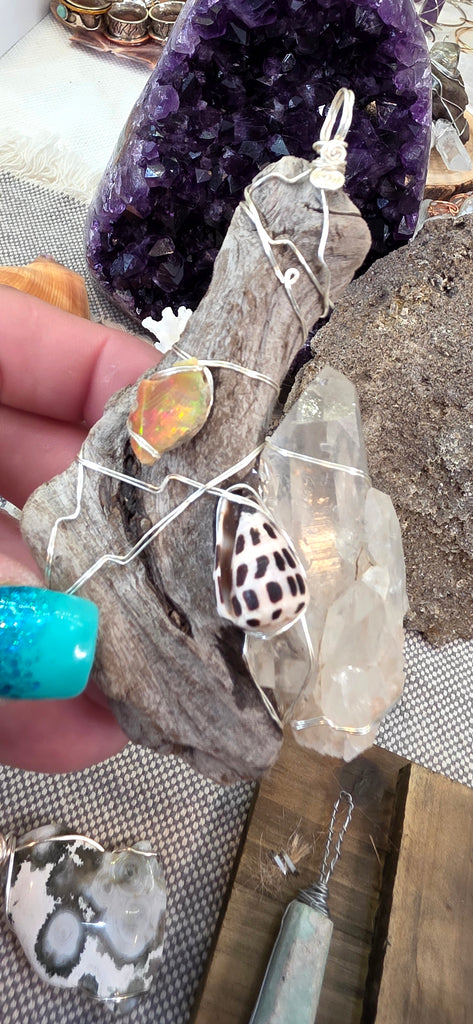DRIFTWOOD WITH EXOTIC SHELL, OPAL AND HIMILAYAN QUARTZ PENDANT/HANGING