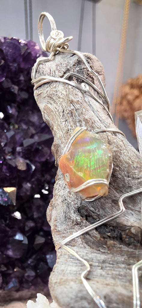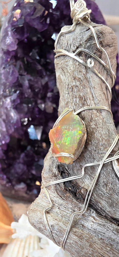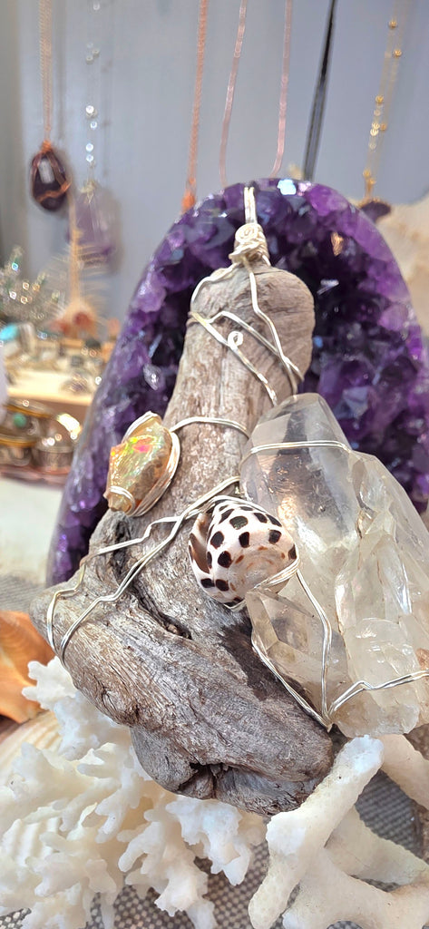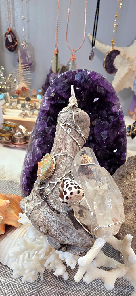 This is a very light weight piece. A one of a kind made with driftwood from the Outer Banks and Ethiopian opal, there is a Himilayan Lemurian Quartz cluster attached as well. Because the driftwood is light as a feather ot is not heavy to wear as a statement piece. This is a Sacred Remedies Collection HAND made piece by Jen.. The Crystal Islands Mermaid 😊