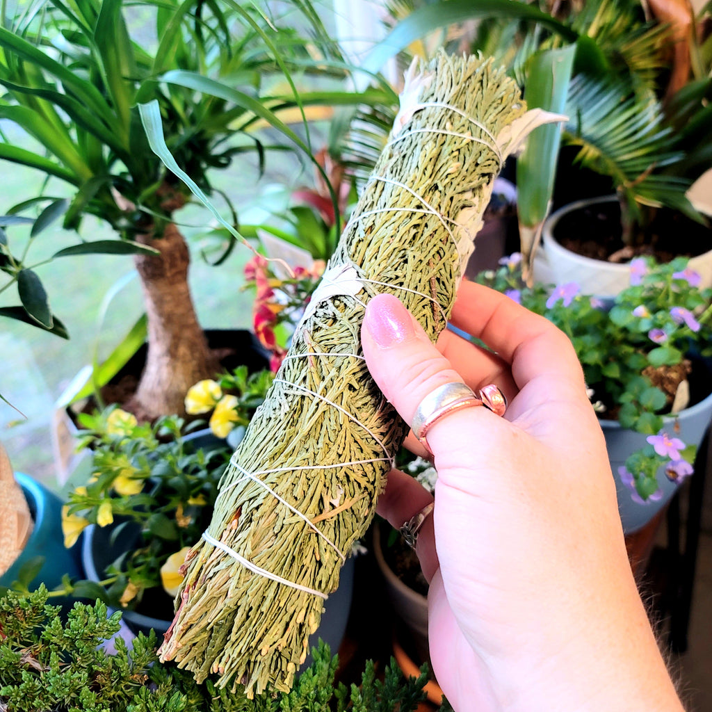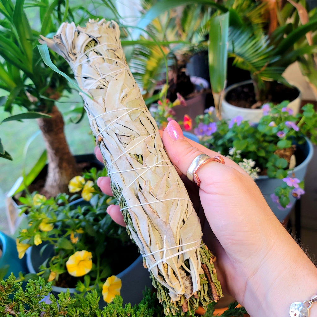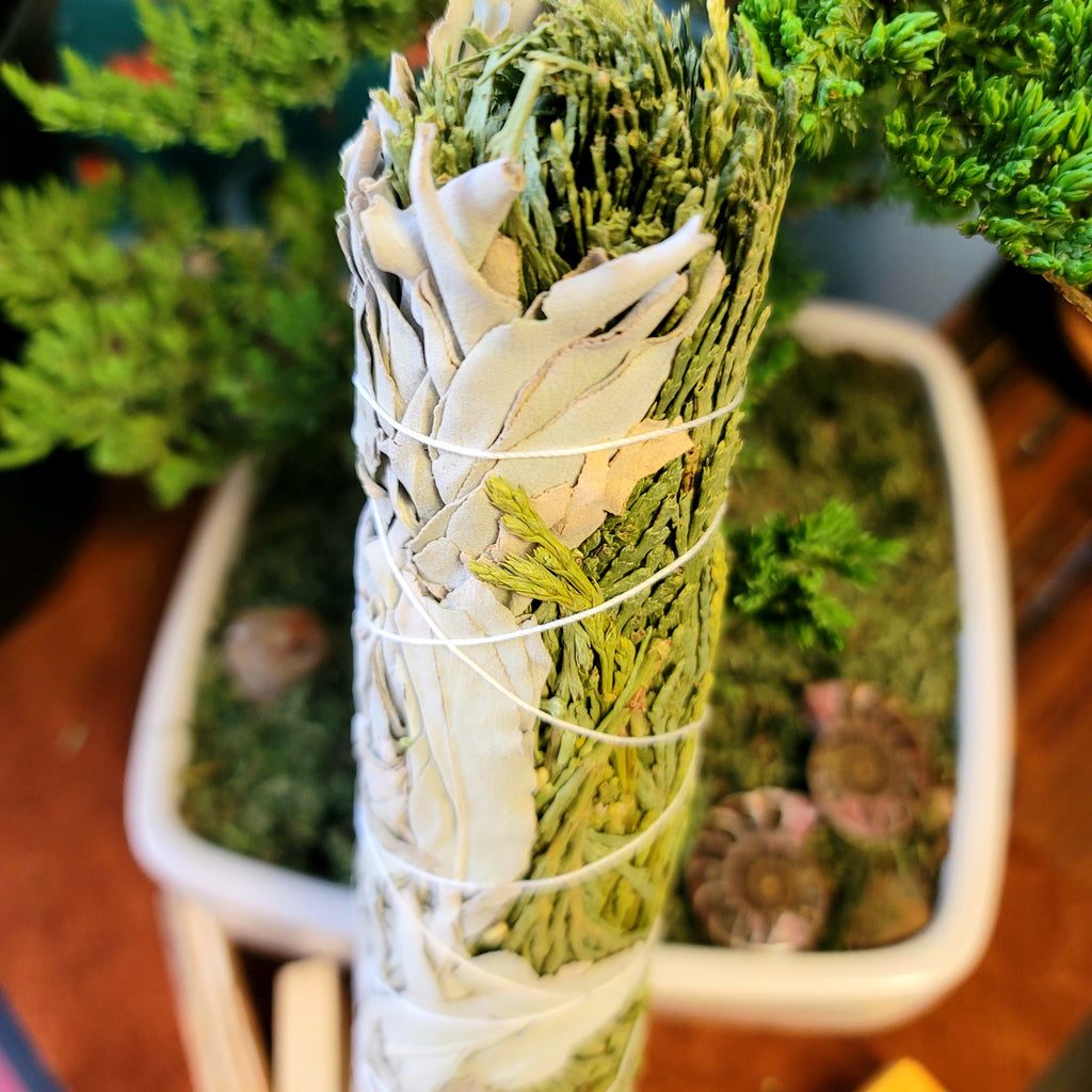 Sage and Cedar Stick  This large stick can be burnt and put out to re-use multiple times for cleansing negative energy, healing energy, and cleansing the energy of your crystals.  Spread the smoke through your home to protect and dispel negative energies and entities.