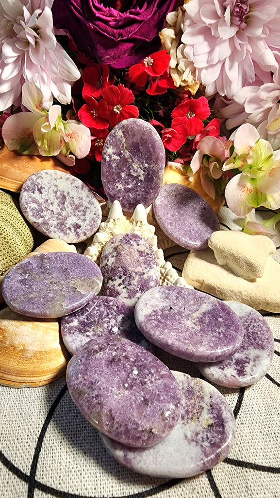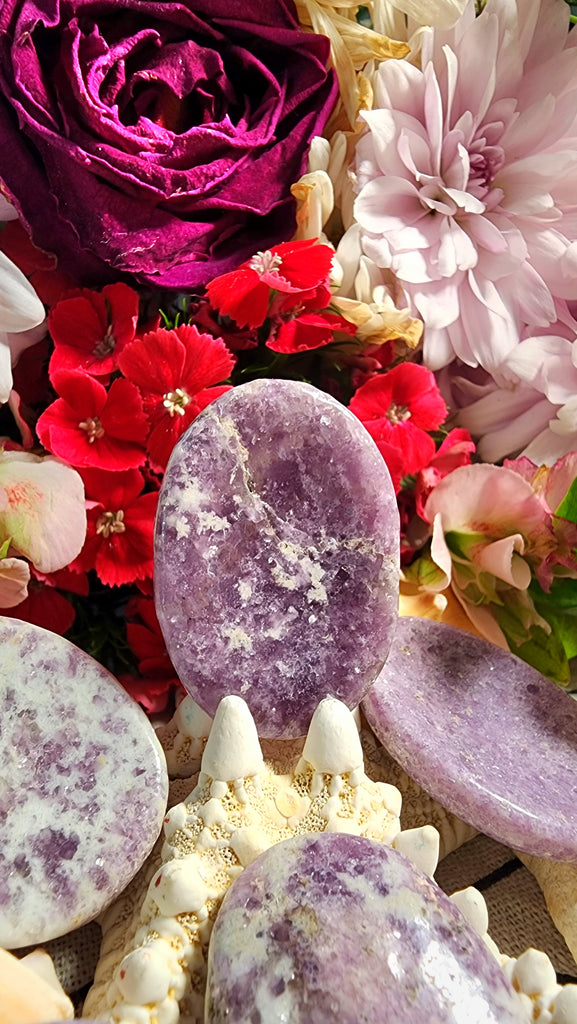 Thus is a Lepidolite worry stone, some have aquamarine, smokey & clear quartz and Tourmaline inclusions.