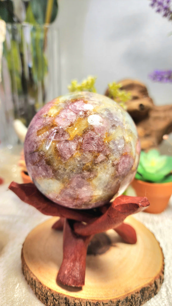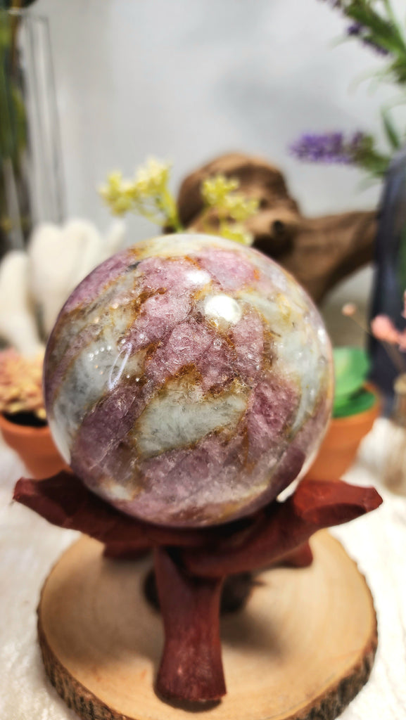 Pink Tourmaline sphere with golden mica, albite, and other inclusions