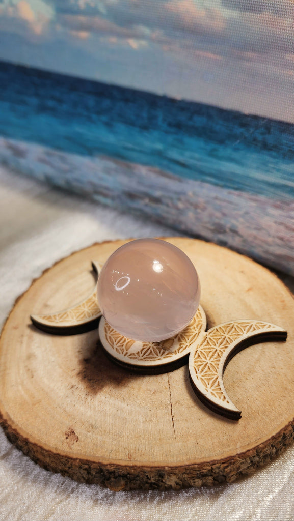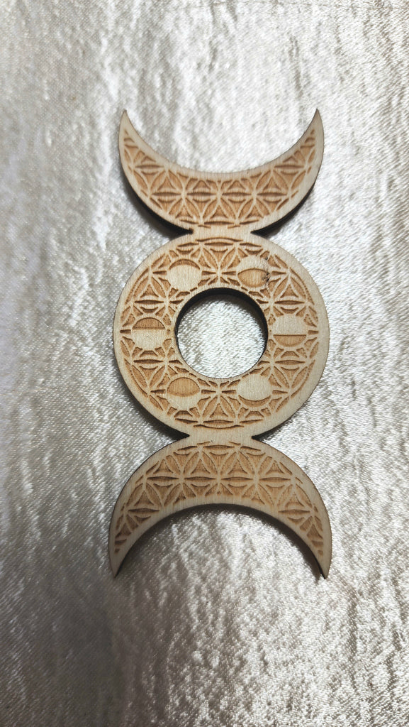 Wooden triple moon sphere stand with flower of life etching. Moon Phase