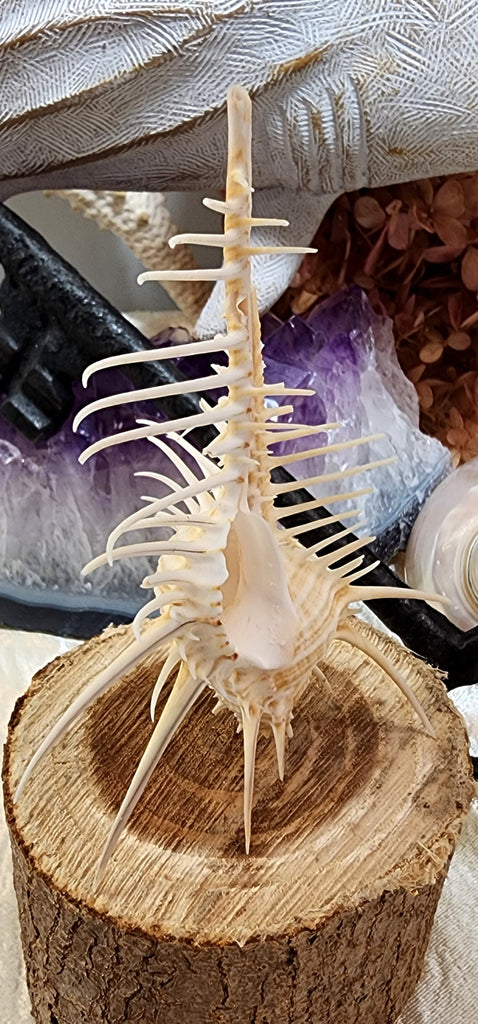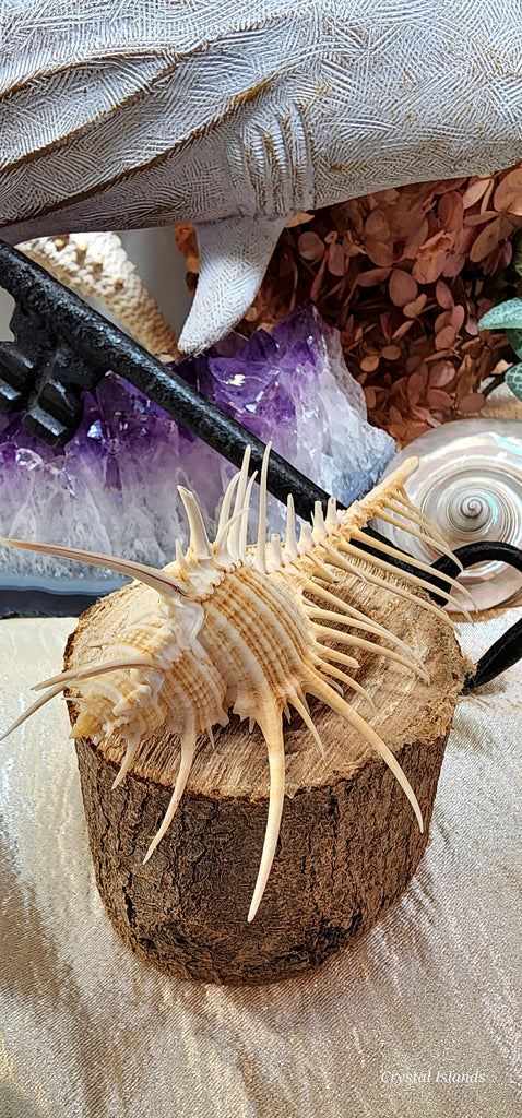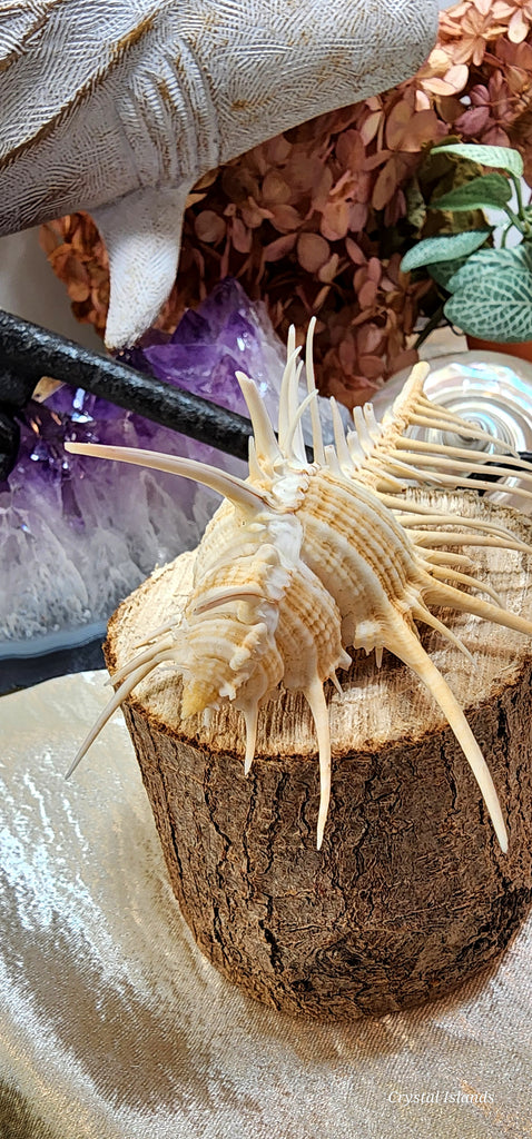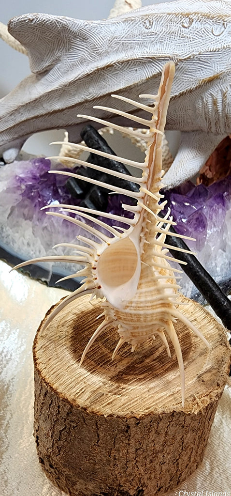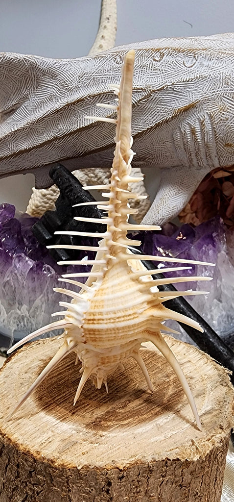 The name Murex Pecten was coined by Aristotle, making it one of the oldest scientific names still in use. Perfect specimens of this shell are not easily found because of the fragility of the numerous long spines. Found in the Indo-Pacific region, they inhabit shallow reefs and rocky areas